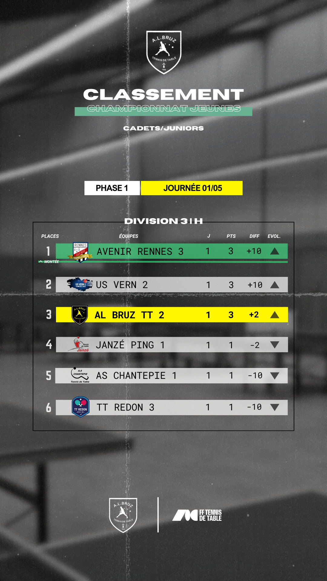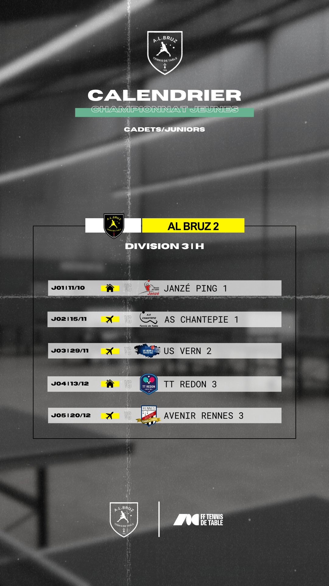 20 déc. 20/12 | AVENIR RENNES TT 3 (CAD./JUN.) AVENIR RENNES TT 3 (CAD./JUN.) | 14:00 | Cad./Jun. | AL BRUZ 2 ALBRUZ-2 |