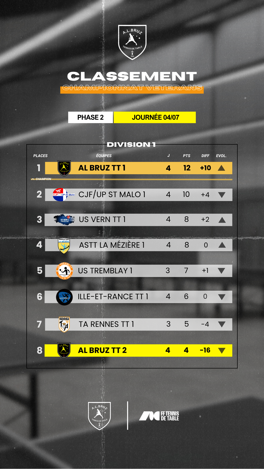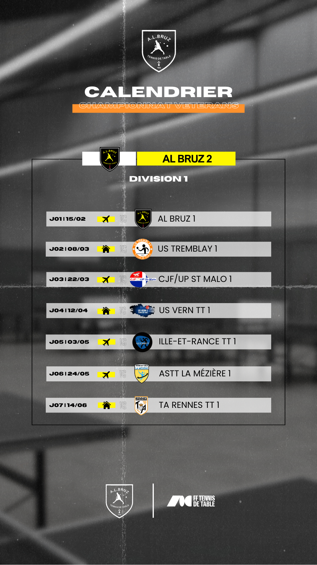| 14 juin 14/06 | Vétérans | AL BRUZ 2 ALBRUZ-2 | 19:00 | TA RENNES TT VÉTÉRAN 1 TA RENNES TT VÉTÉRAN 1 | |