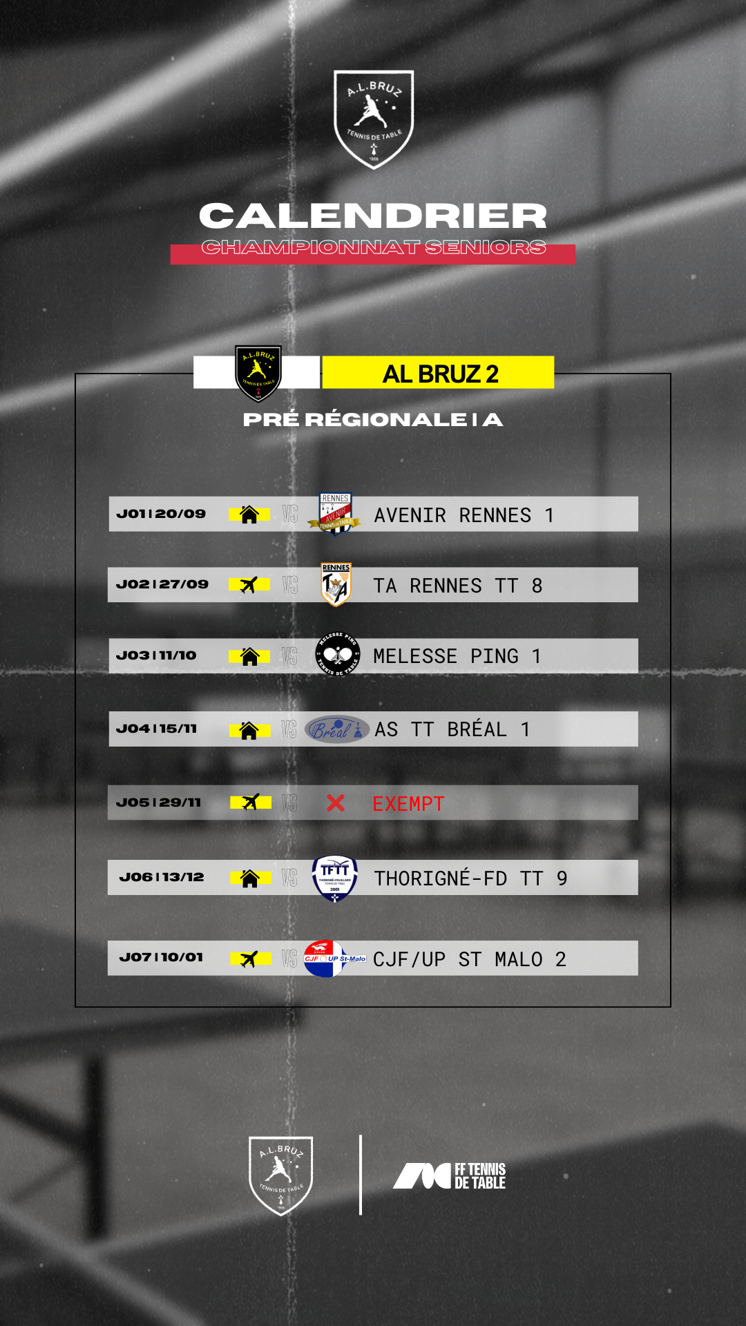 15 nov. 15/11 | Seniors | AL BRUZ 2ALBRUZ-2 | 20:00 | AS TT BRÉAL 1AS TT BRÉAL 1 |