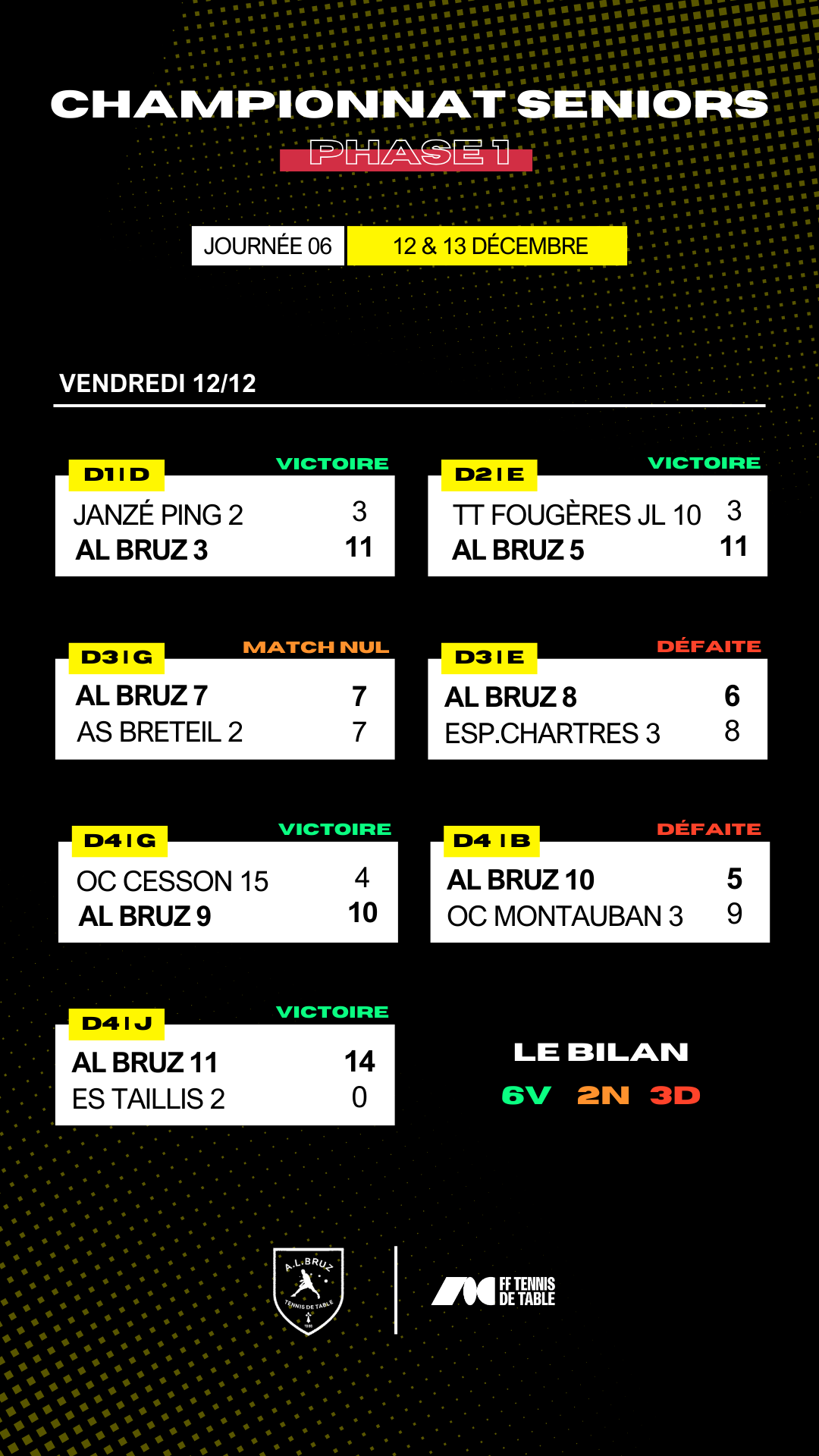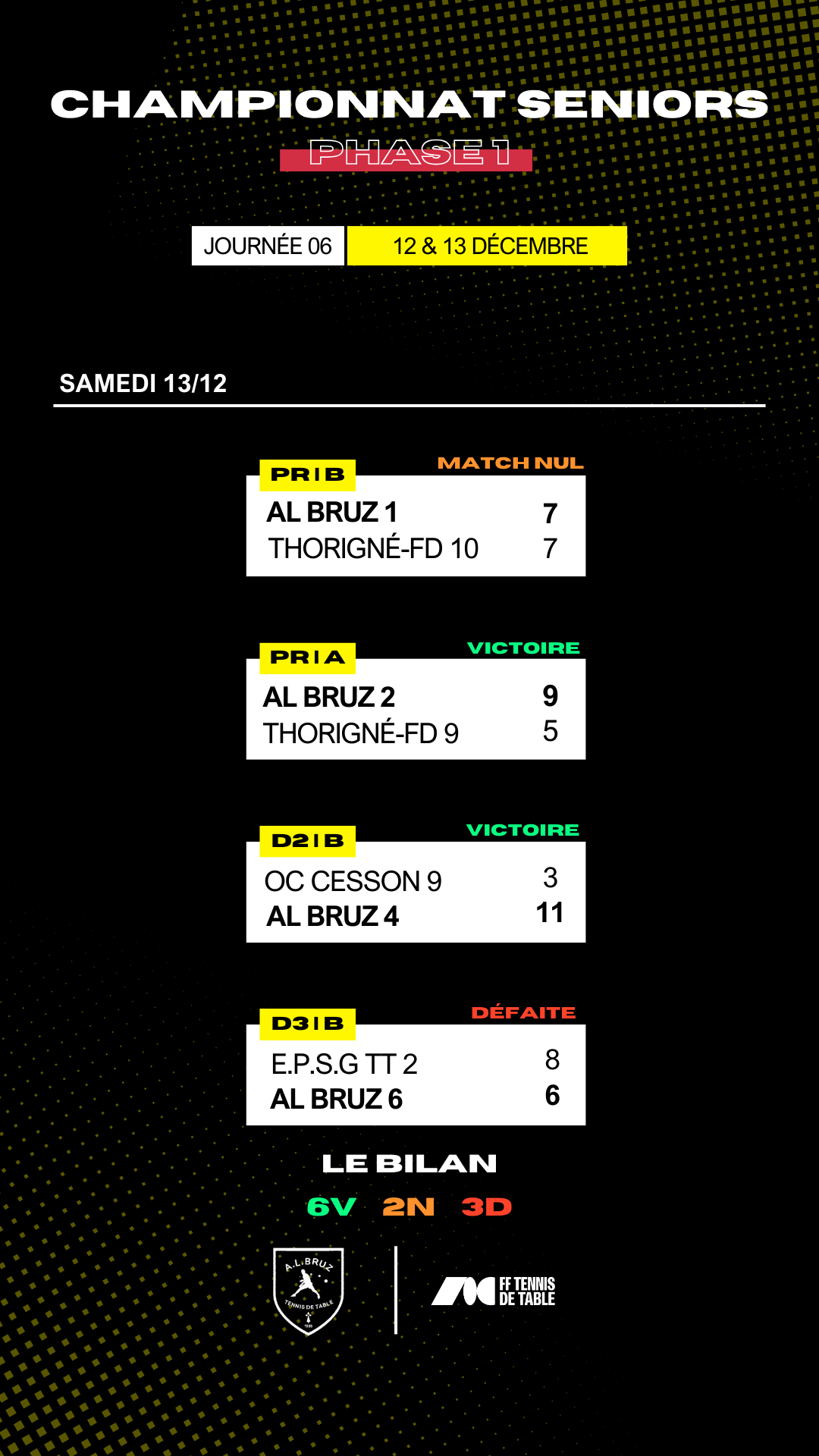 A l'issue de cette 6ème journée, nos équipes seniors affichent le bilan sportif est le suivant : 6 victoires ✅, 2 matchs nuls ➖ et 3 défaites ❌