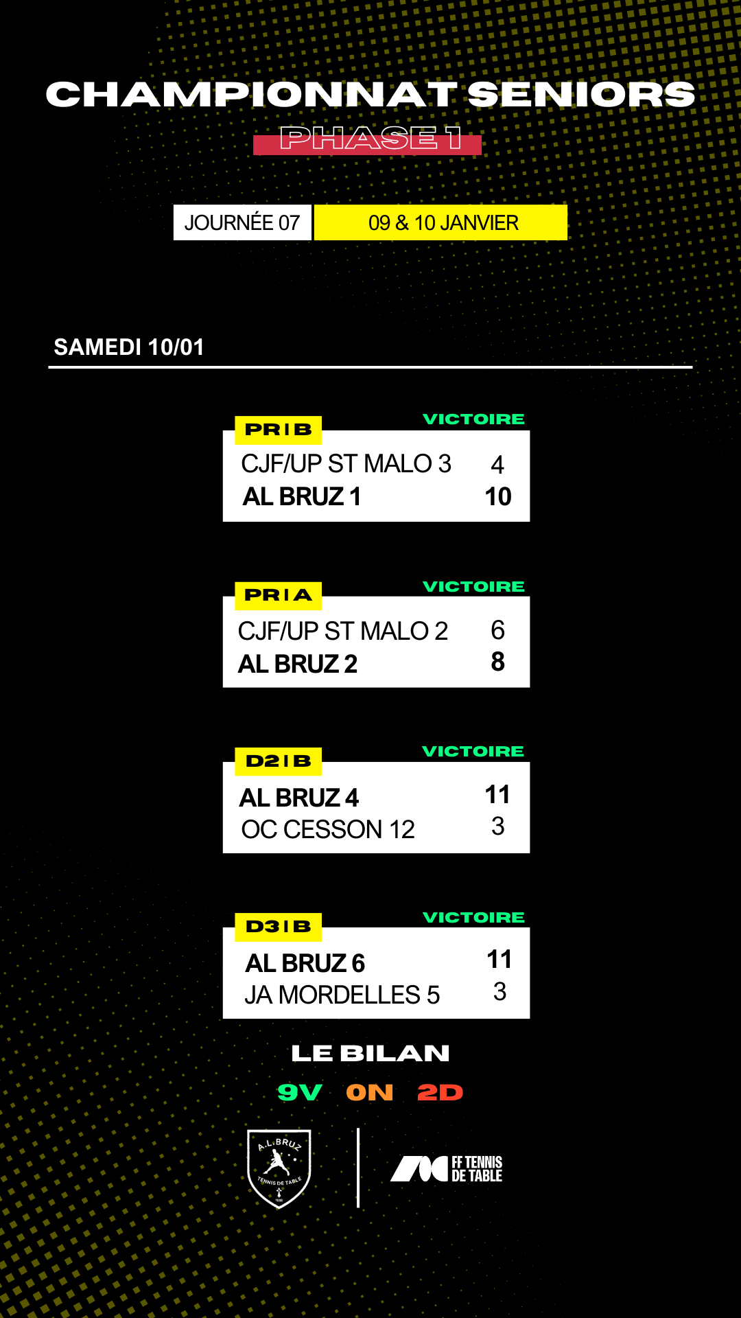 A l'issue de cette 7ème journée, nos équipes seniors affichent le bilan sportif suivant : 9 victoires ✅, 0 match nul ➖ et 2 défaites ❌