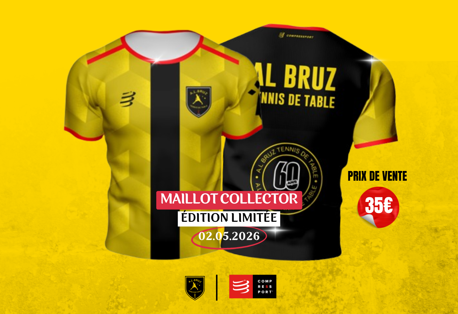 Pour célébrer les 60 ans du club, l’A.L. BRUZ Tennis de Table vous propose un maillot collector en édition limitée, spécialement créé pour cet anniversaire exceptionnel 🎉