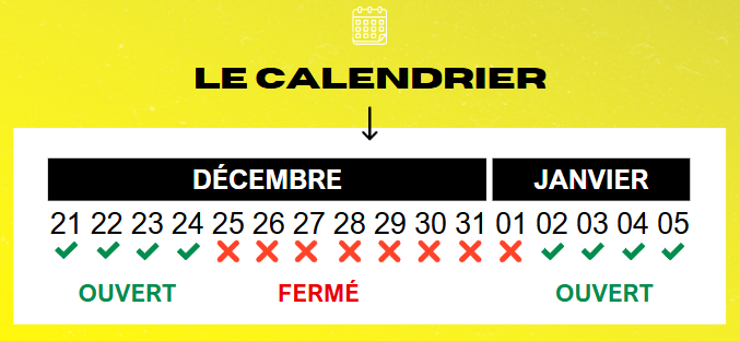 - Du lundi 22/12 au mercredi 24/12 (ouvert aux horaires habituels)